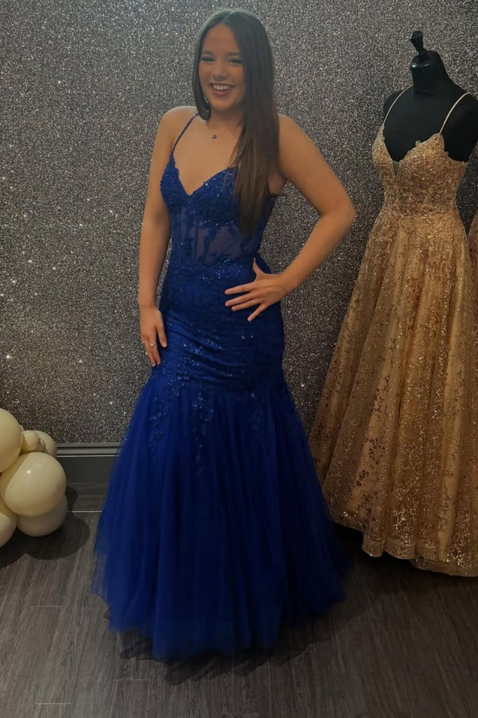 V Neck Mermaid Blue Lace Long Prom Dress, Mermaid Blue Formal Dress, Blue Lace Evening Dress A2498